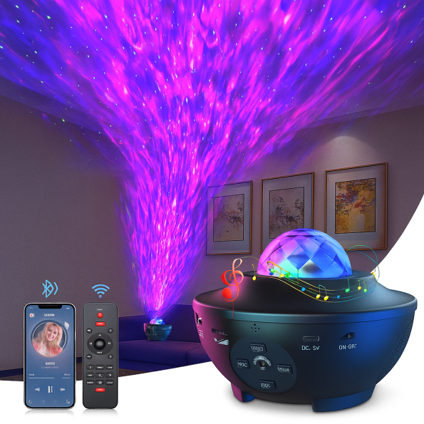 24 Colors Dynamic Projections : Five standard colors, they are red water wave, blue water wave, green water wave,white water wave and green laser point,each two colors can be mixed and each two water wave colors also can be mixed with green laser point, so you can get as most 24 colors. A variety of colors combined with dynamic night projection of different speeds, creating a relaxed, romantic, colorful space projection atmosphere, to show you a gorgeous starry light.