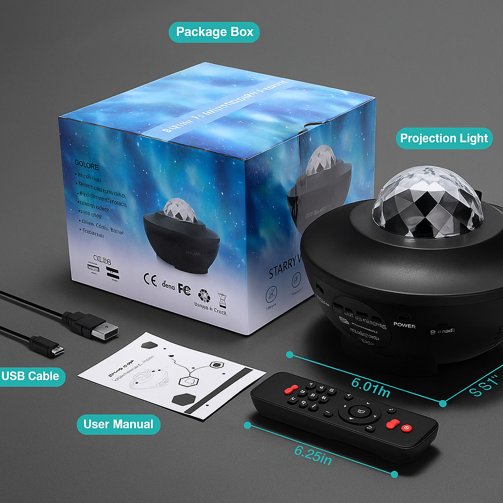 Functions: LED Projector light, Music Speaker, Bluetooth, Remote control
